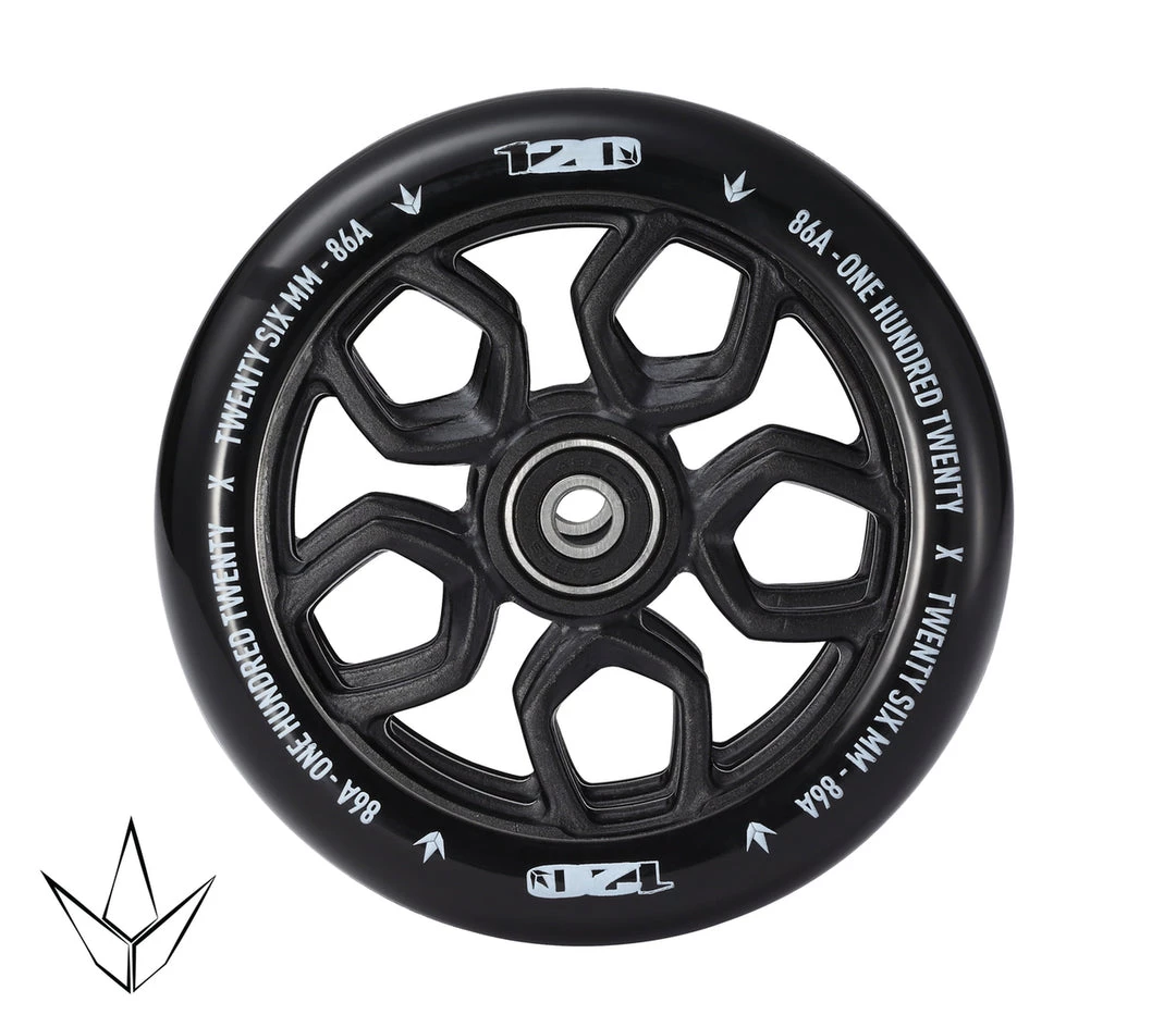 120mm by 26mm – make sure your FORK and your DECK can run 120mm x 26mm wheels