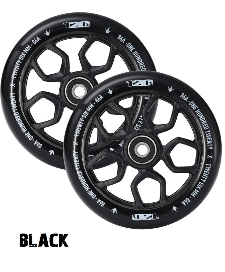 120mm by 26mm – make sure your FORK and your DECK can run 120mm x 26mm wheels