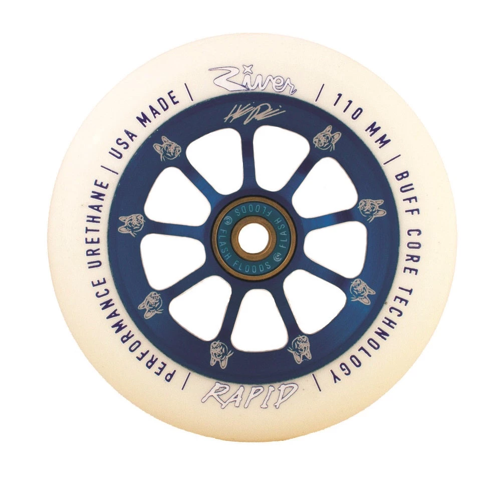 Strong, responsive and durable River Rapids will have you shredding the streets while keeping your flow. Featuring BUFF Core Technology which helps absorb impact, reduces de-hubbing and creates a smoother ride. All River wheels are manufactured with bearing removal slots for quick bearing replacement. All River wheels come with River Flash Flood Bearings pre-installed. The iconic 9-spoked anodized 6061 T-6 aluminum core creates a perfect balance of weight, strength and durability for a superior ride. Limited 90-day warranty against chunking and de-hubbing. 100% Made In California.”