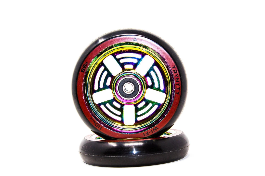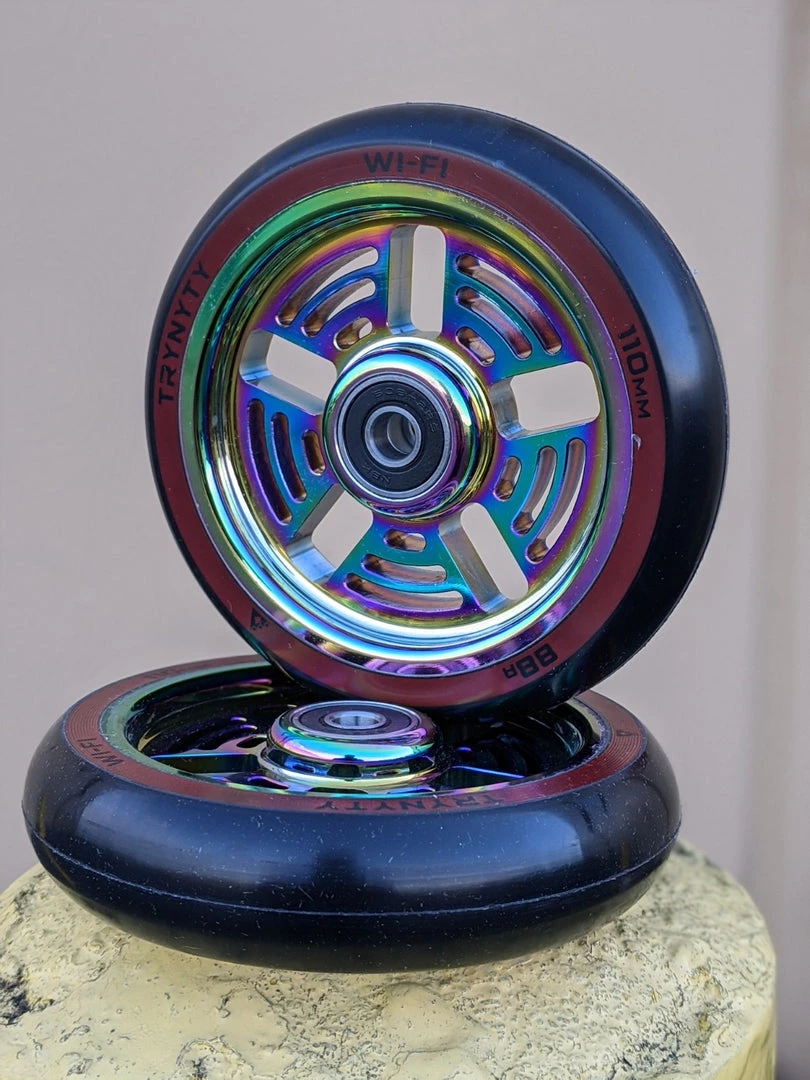 Trynyty Scooters Wi-Fi pro scooter wheels are a 110mmx24mm with 88a hardness rating. These are the oil slick wifi version.