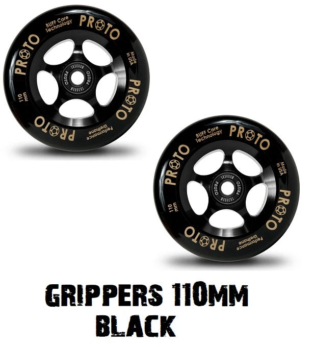 Gripper wheels are some of the fastest wheels on the market. PROTO Wheels are made in the USA and have an anodized core for durability. Featuring BUFF Core Technology to reduce dehubbing. All PROTO Scooter Wheels come with bearing removal slots for taking bearings out with ease. These wheels come with High Quality PROTO Murders Bearings Pre-installed. PROTO – STICKERS INCLUDED. Limited 90-day warranty.110 MM Wheel-Grippers are very fast and grip the surface